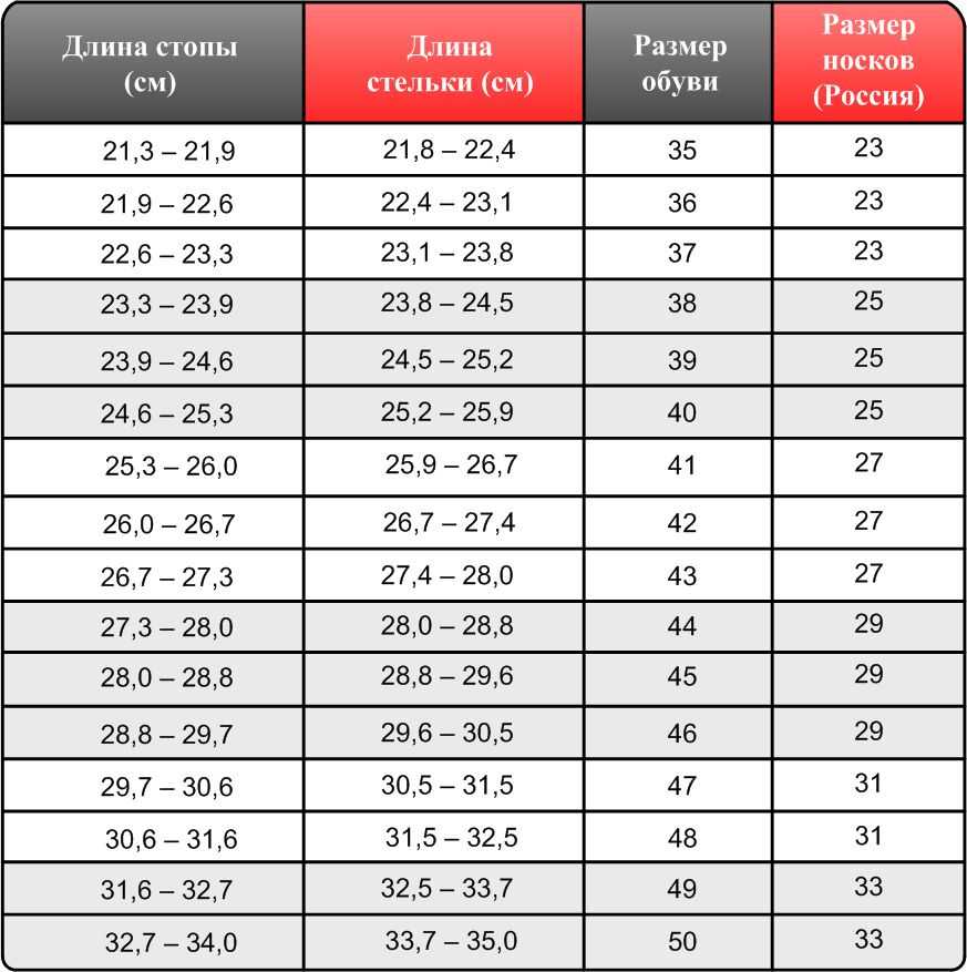 Мы предлагаем воспользоваться таблицами для определения правильной цифры носочков, в которых собраны сведения о длине стопы, размерах обуви и чулочно-носочных изделий. Часто в них даются сведения и о европейских размерах. Для удобства таблицы разделены по гендерному признаку.