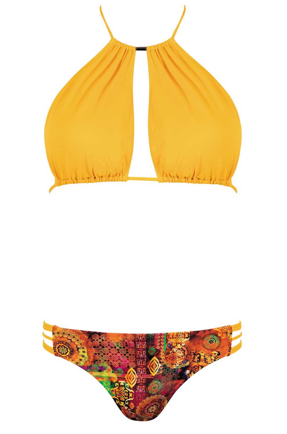Одно из самых распространенных цветовых сочетания – это желто-синий. В таком исполнении представлены купальники слитного и раздельного плана. Во втором случае, чаще всего низ в синем, а верх в желтом цветах или наоборот. Если касаться раздельных желтых купальников, то сегодня в моде несколько наиболее интересных моделей: