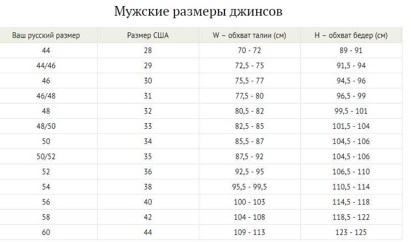 Для упрощения задачи при выборе товара на сайтах джинсовых магазинов имеется размерная сетка мужских брюк. Чтобы в ней ориентироваться, достаточно знать свой рост: