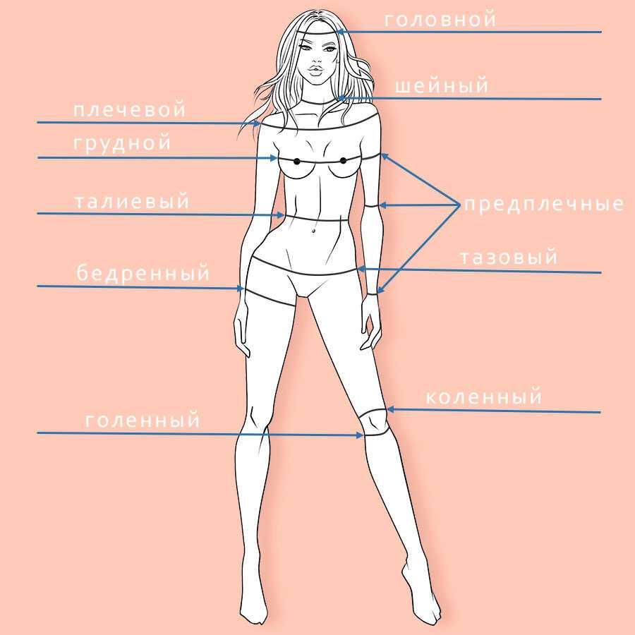 (1) Обхват шеи: Сантиметр должен обернуть шею у основания – там, где она соединяется с плечом. Лента проходит параллельно полу, должна плотно прилегать к коже, но не сдавливать горло. В передней части шеи она будет проходить под кадыком.(2) Обхват груди: Дыхание ровное, без глубоких вдохов и выдохов. Сантиметровая лента обхватывает грудь по самым выпуклым частям впереди, под подмышечными впадинами сбоку и по выступающим частям лопаток сзади. Положение ленты при этом измерении будет не строго горизонтальным, так как со стороны спины она должна быть приподнята. Поэтому лучше, если вам кто-то поможет с этим замером. Внимательно следите, чтобы лента не перекручивалась, не провисала и плотно прилегала к коже.(3) Обхват талии: Талия замеряется на той высоте, на которой у вас обычно располагается ремень брюк. Измерительная лента опоясывает талию строго горизонтально, плотно прилегая по всей длине. Учтите, что длина ног будет измеряться именно от этой высоты – высоты расположения вашего ремня (талии). Если есть сомнения, где именно будет проходить пояс изделия, то замеряйте талию на уровне пупка.(4) Обхват бедер: Сантиметровая лента обхватывает тело по самым выступающим точкам бедер и ягодиц. При стандартном телосложении измерительная лента должна обхватывать тело горизонтально. Однако если строение тела таково, что живот сильно опускается в зону бедер, то спереди сантиметр следует проводить под животом.(5) Длина ноги по внутреннему (шаговому) шву: Старайтесь не наклоняться вперед или назад. Следите, чтобы ноги не сгибались в коленях. Замер делается по внутренней стороне ноги от паха (непосредственно под лобковой костью) до пола. Здесь также желательна помощь со стороны, потому что самостоятельно снять эту мерку затруднительно.Длина ноги по внешнему шву (боковая длина брюк): Замер производится вдоль боковой стороны ноги от линии талии до пола (без обуви), прижимая сантиметр к ноге. Чтобы измерить этот параметр правильно, лучше обратиться к кому-то за помощью.(6) Длина рукава: Измеряется с участием помощника. Рука должна быть чуть согнута в локте. Нулевая отметка сантиметра фиксируется на конце плеча (точке, где плечевой шов одежды соединяется с рукавом). От плеча лента тянется по внешней стороне предплечья через локоть (на локте также нужно ее придерживать) до запястья.(7) Ширина плеч — Конец плеча легко прощупывается: это крайняя неподвижная косточка плеча, очевидная, если двигать рукой вверх и вниз. На одежде в этой точке шов плеча соединяется с рукавом. Соответственно, ширина плеч — это расстояние от одного до другого конца плеч. Ширина плеч измеряется со стороны спины, поэтому проводится с участием помощника. Сантиметровая лента располагается параллельно полу.