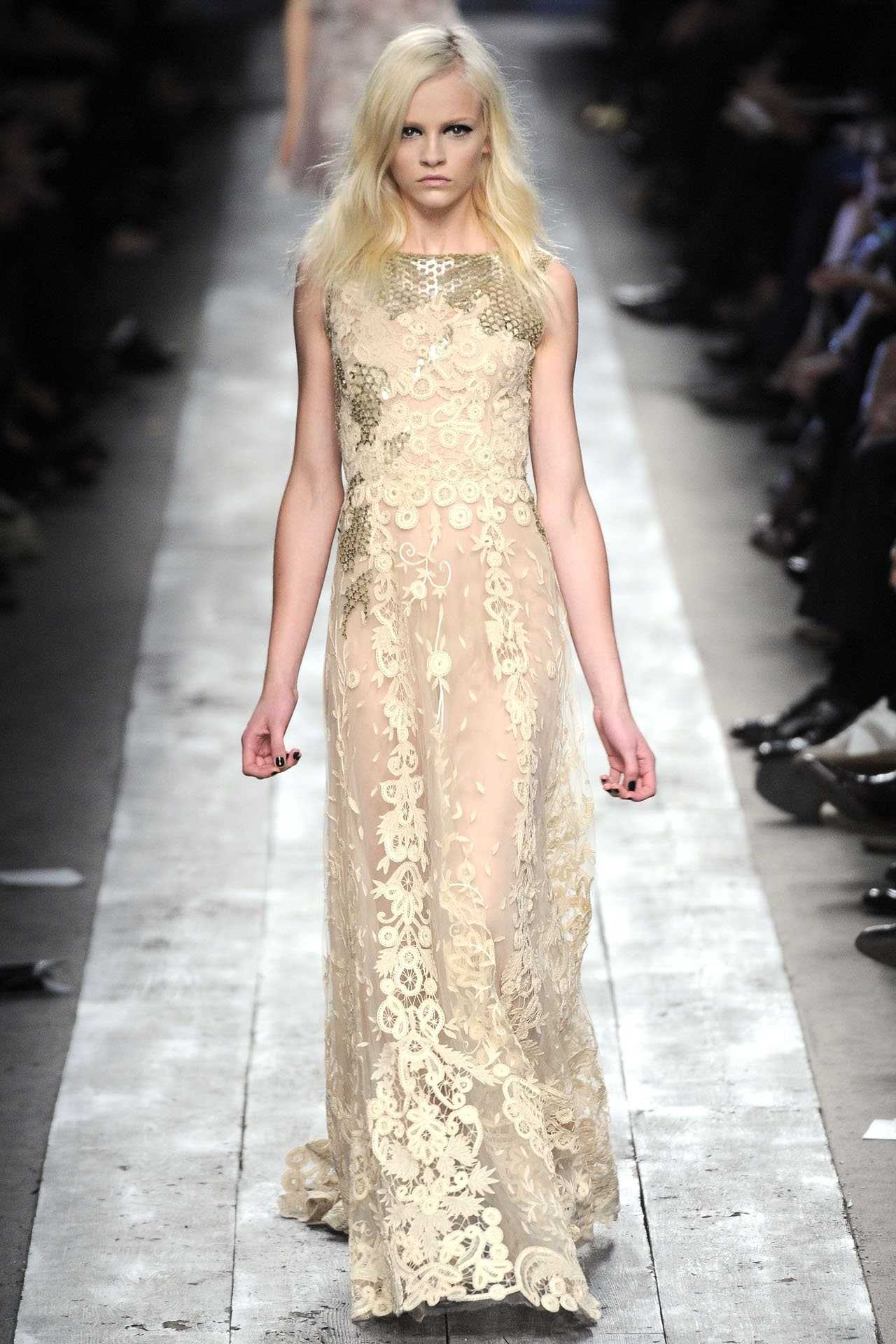 Наряд прекрасно узнаваем: крой сравнительно лаконичен и прост. Он уже кверху и шире книзу, за счет чего удается сделать фигуру максимально пропорциональной и женственной: