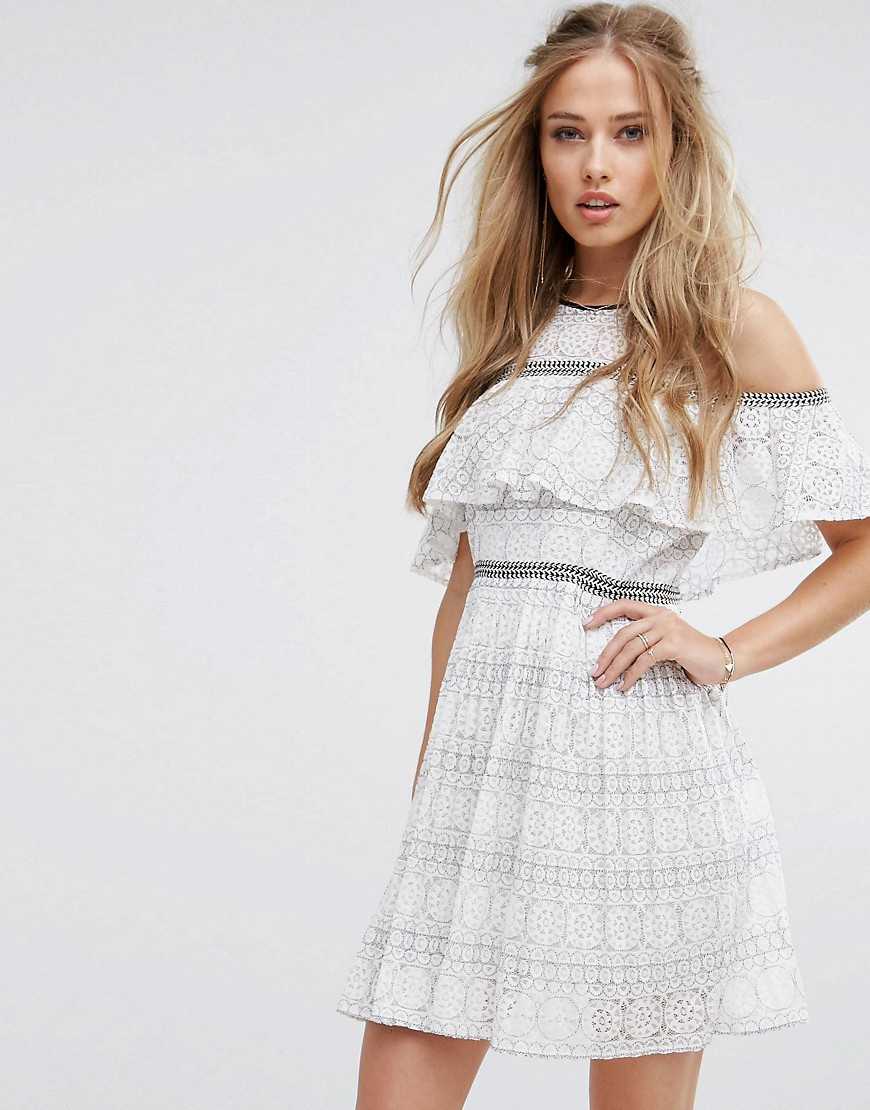 Отдельным сюжетом нашей истории станет кружевное белое платье. Мы решили его особо выделить, потому что кружево (пусть разных видов) особенно популярно среди прекрасных дам на протяжении уже нескольких сезонов. Очень многие предпочитают создавать с таким платьем повседневные луки, при помощи джинсовой куртки, грубых черных или коричневых ботильонов, босоножек на танкетке (или устойчивом каблуке), сумки с бахромой, соломенной шляпы и солнцезащитных очков