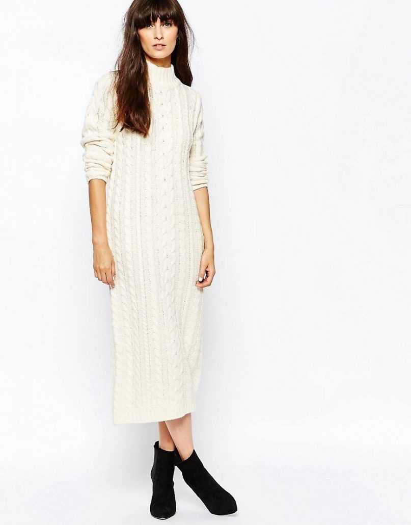 - Шерстяные платья – самые теплые и приятные. Особенно, если сделаны из мягкой, не колючей пряжи. Но такие платья, во-первых, требуют бережного ухода (стирать только при 30 градусах в режиме ручной стирке, а сушить на горизонтальной поверхности). А во-вторых, в помещении в них ужасно жарко. Поэтому для уличных прогулок такие вязаные платья станут идеальным приобретением. Если же вы планируете провести день в офисе, есть шанс, что вы в нем просто вспотеете. Да и цена таких платьев высока – от 5000 до 20 000 рублей (в масс-маркете и мидл-сегменте).