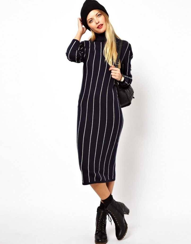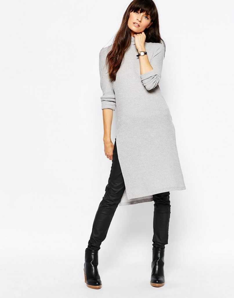 Брюки, леггинсы или брюки можно надеть вместе с вязаным платьем только в том случае, когда оно имеет мини длину и больше похоже на удлиненный свитер. При этом низ должен быть темным и плотно облегающим.