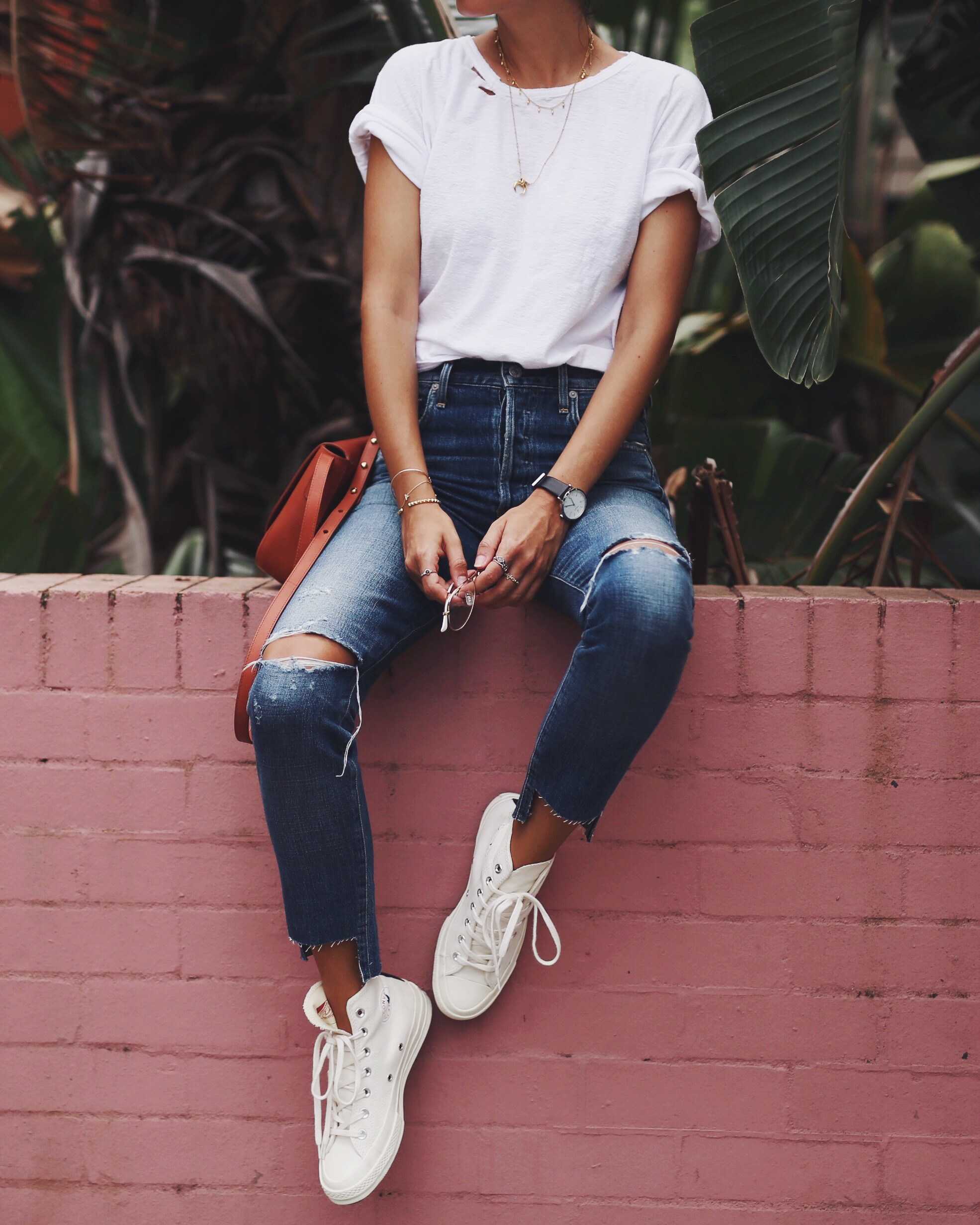 Если ваша фигура идеальна, рассмотрите возможность сочетать белые джинсы с высокой посадкой с укороченным топом. В качестве предпочтительной обуви выступают не кроссовки, а туфли на высоком каблуке или босоножки с тонкими ремешками.