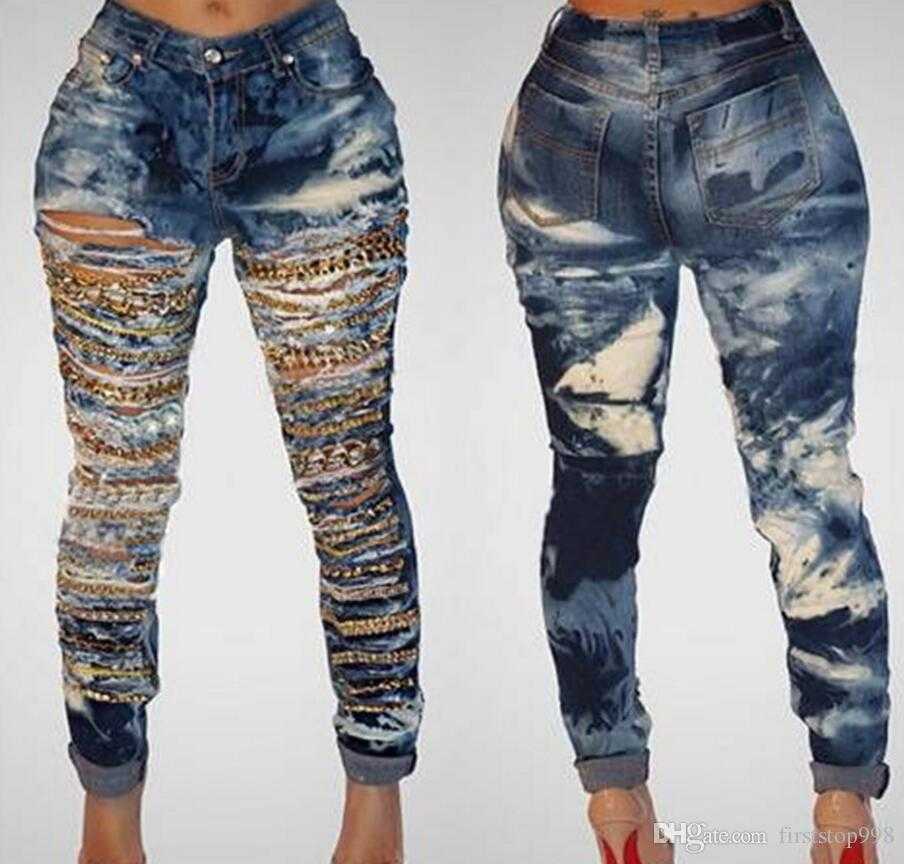 Актуальны и джинсы, которые покрыты россыпями дырочек, сосредоточенных в областях потертостей на материи. Вы также можете рассматривать для себя длинные джинсы с прорезанными краями. Они смотрятся неизменно стильно, причем не только весной, но и в любое другое время года. Они станут хорошим решением для женщин, которые хотят создать молодой и свежий образ. Хорошо подворачивать брючины у таких джинсов, носить их с высокими сапогами. Что касается декоративных элементов, это могут быть цепи, крупные ремни.