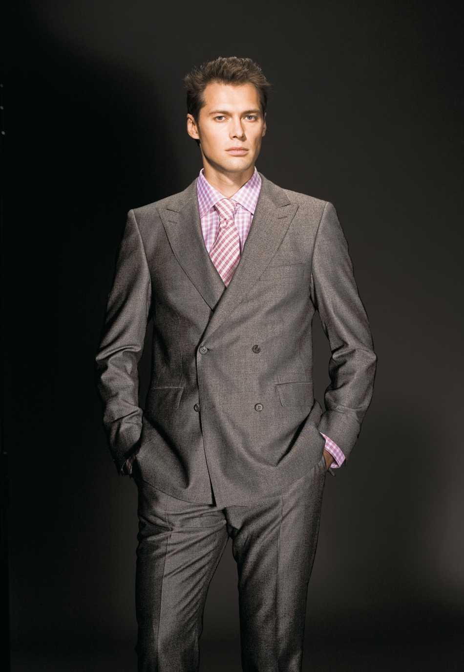 Сочетание галстука с серым костюмом: галстук темнее рубашки, но светлее костюма![]()