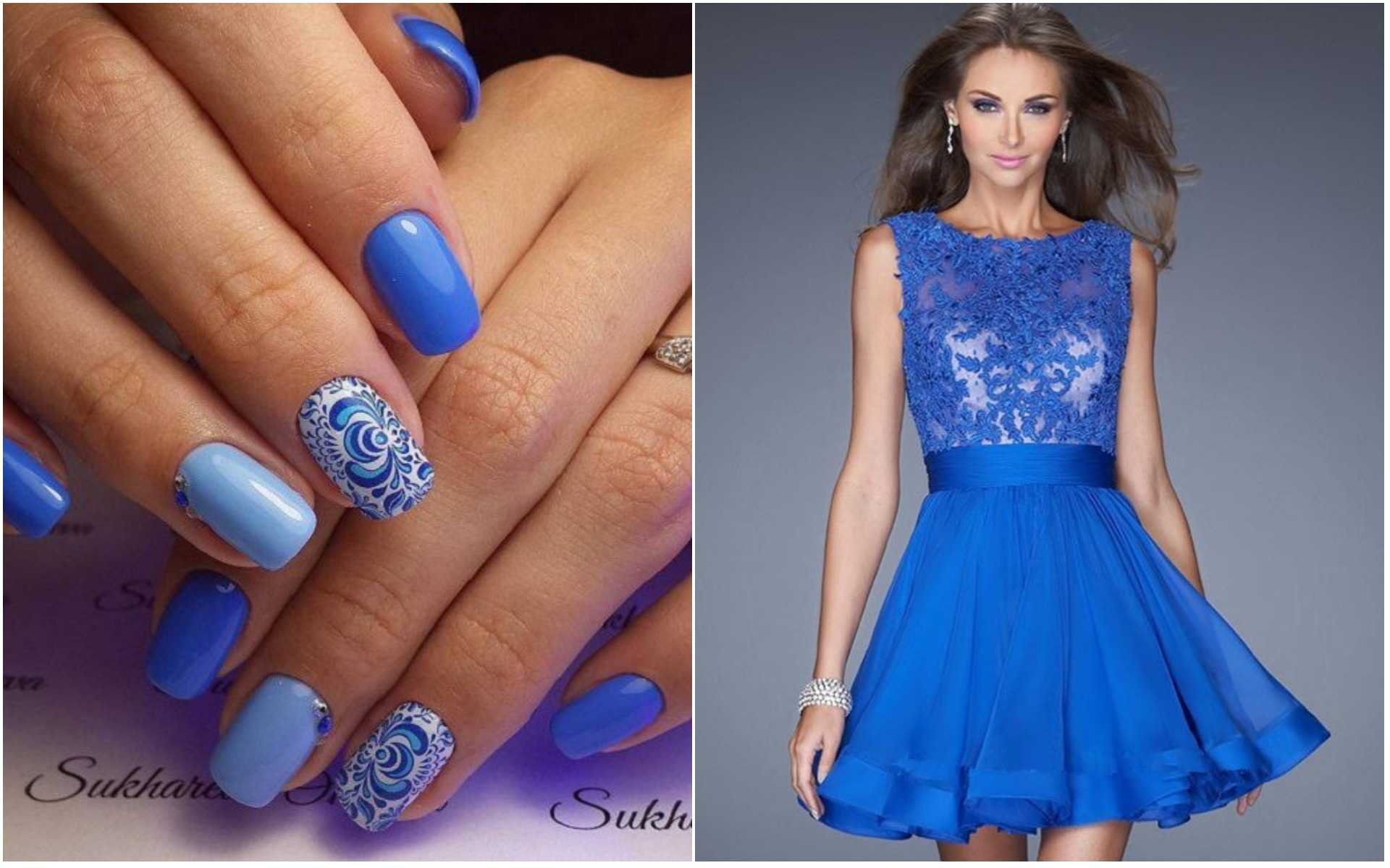 С синими платьем удачно сочетается маникюр в технике «кошачий глаз» с камнями синего или белого цвета. Интересно смотрятся контрастные нейл-арты с бело-голубой россыпью камней. Под образ в синем цвете выбирайте нейл-арты с белым, серебристым, мраморно-серым, жемчужно-розовым цветом. При этом можно использовать как матовую, так глянцевую текстуру гель-лака.