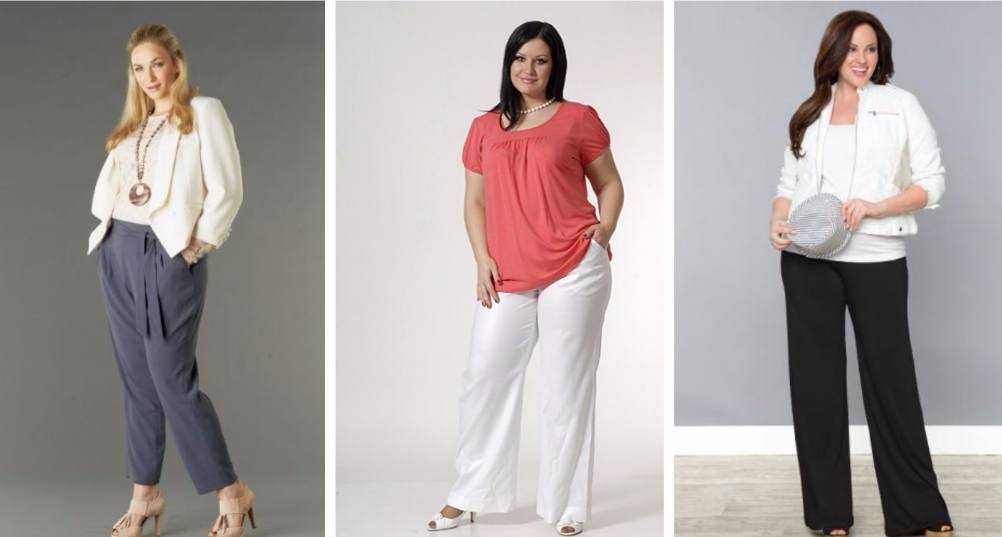 Полных женщин украшают брюки облегающего фасона: стрейч или джинсы. При изящных лодыжках и аккуратной форме бедер можно носить скинни классической длины или слегка укороченные. Дамам с крупными ногами больше подойдут модели, прилегающие в области ягодиц, слегка расширяющиеся вниз. Небольшой клеш зрительно выравнивает объёмы. В дополнение к брюкам рекомендуется носить элегантные туники-рубашки, слегка удлиненные джемперы. Поверх комплекта отлично выглядят укороченные жакеты, куртки, классические плащи или пальто.