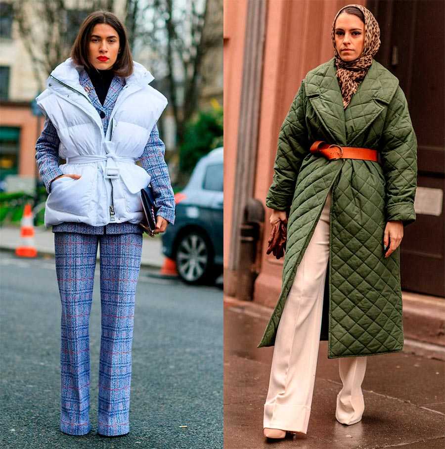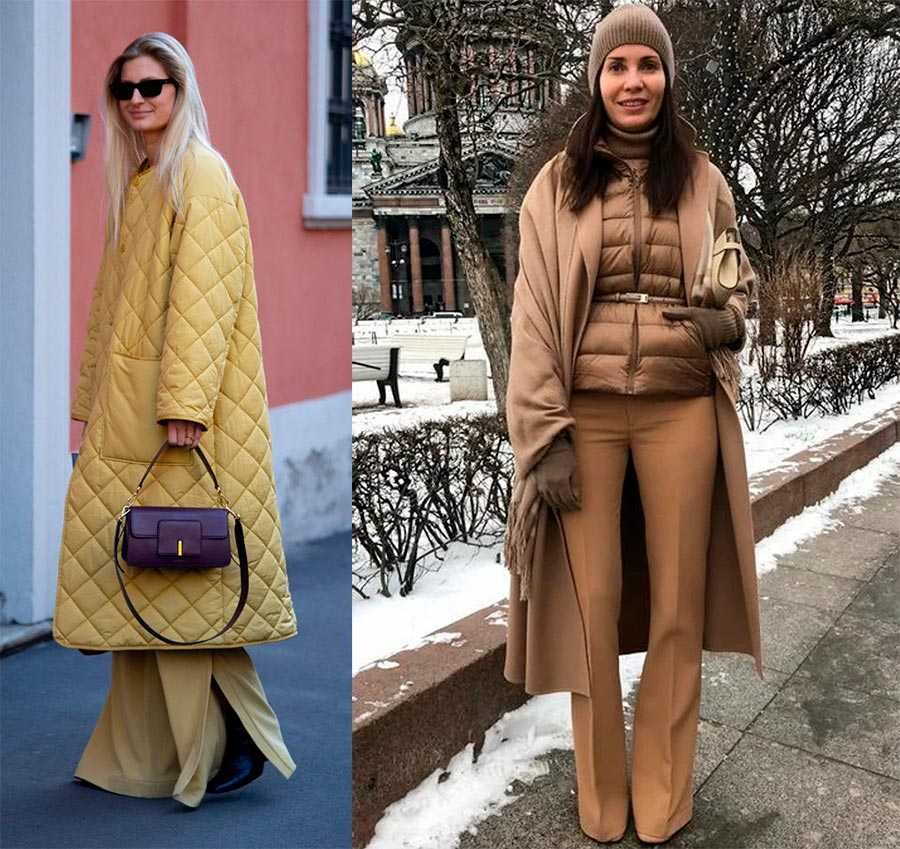 Для зимнего периода, когда мы начинаем заваривать чай с корицей и чаще слушаем новогодние мелодии, когда идет мягкий снег и все достают шапки бини, выбирайте более плотное пальто на утеплённой подкладке или актуальное стеганое, длины миди. Оно создаст идеальные образы с «палаццо» для морозных дней. Как вариант, используйте многослойность и надевайте тонкий пуховый жилет под верхнюю одежду.