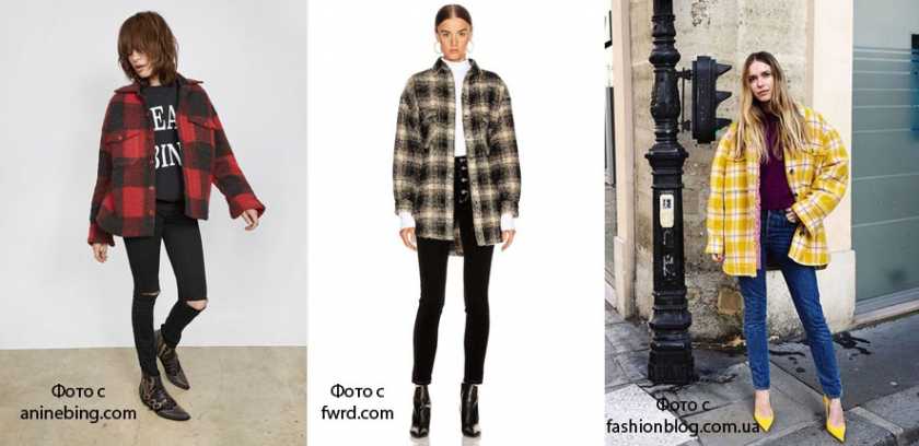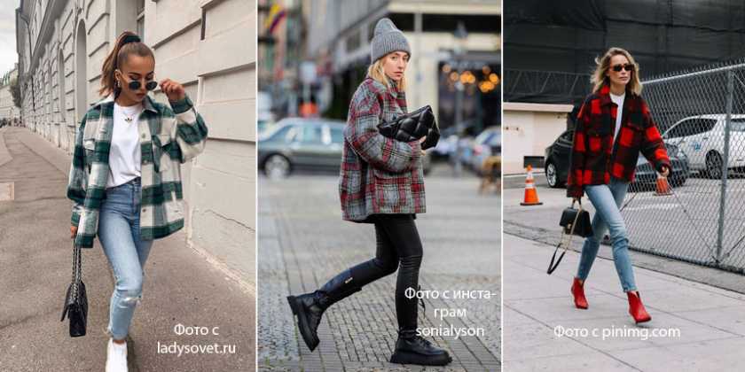 Клетчатые рубашки переживают новый бум. Теперь она из плотной ткани и напоминает рубашку лесорубов. Их тоже носим со скинни. Можно на голое тело, либо под низ рубашки – футболку, водолазку, лонгслив. Рубашку можно оставить как застегнутой, так и расстегнутой, добавив в образ вертикали. Еще можно поиграть с цветом нижнего слоя и аксессуаров. Выбираем те оттенки, которые есть в рубашке, и уводим их в футболки, топы, сумки, обувь.