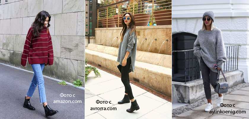 Свитер должен быть крупной вязки и свободного кроя, чтобы создать достаточный объем. Носим свитер навыпуск, либо подправляем на одну ладонь спереди или сбоку, обозначив тем самым талию и удлинив ноги.