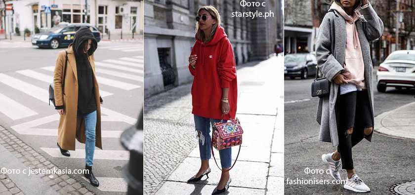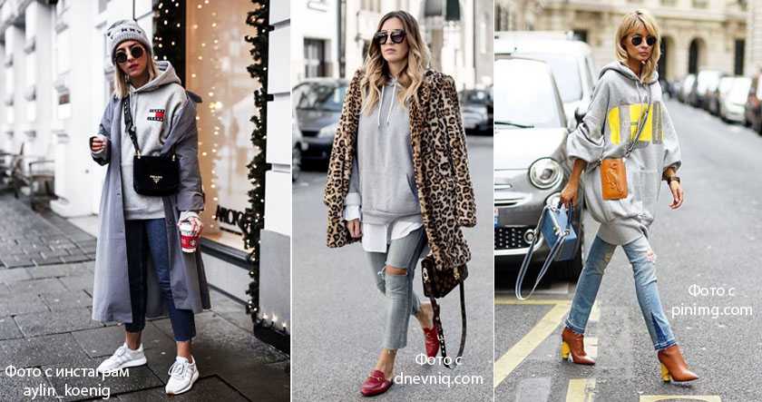 Скинни и худи – этот образ любим многими, так как удобен и практичен. В особенности его любят мамочки в декрете: для прогулки с детьми – отличный вариант. Добраться до спортивного клуба – тоже хорошо. Носим худи не только с обувью на плоском ходу, но и на контрасте с каблуками. Контрастные сочетания всегда смотрятся выигрышно.