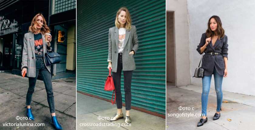 Пиджак, наверное, самый известный способ стилизации скинни. Под такой верх можно надеть вещь прилегающего силуэта (кроп-топ, водолазка), а можно и свободного (футболка). Если в образе присутствует объемный верх и обувь с широкими голенищами (сапоги-трубы), скинни выступают в качестве баланса объемов, сохраняя женственный силуэт в образе. Пиджак можно застегнуть, можно оставить расстегнутым, а можно подпоясать ремнем, обозначив талию.