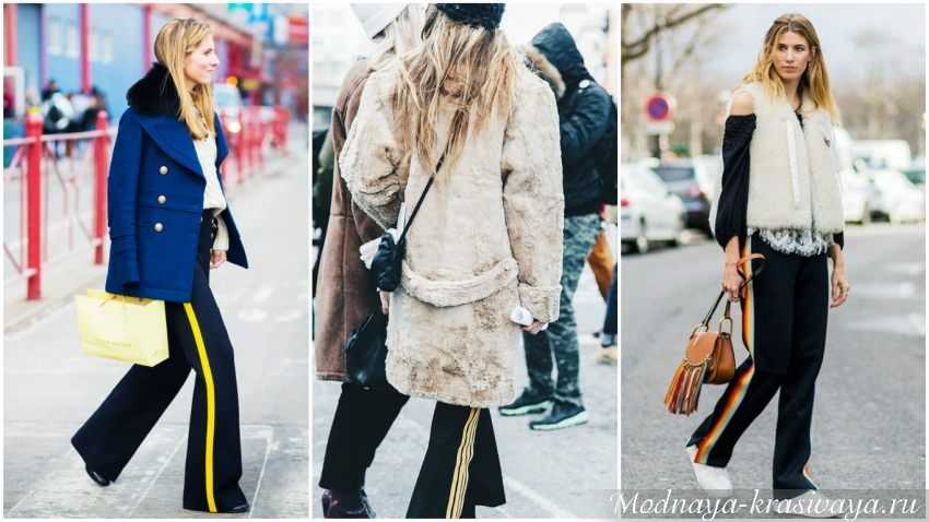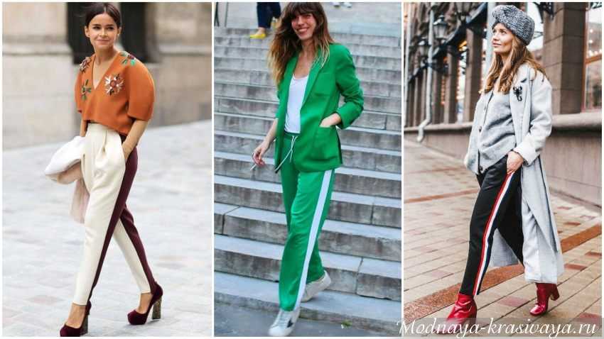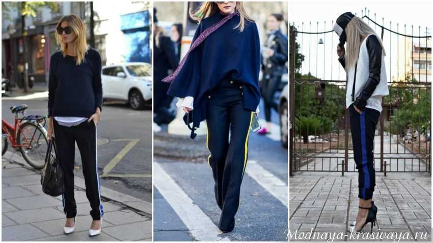Если вы предпочитаете стиль smart casual, к брюкам с лампасами подберите свободный свитер или легкий джемпер. Другой вариант – облегающие модели с кожаной курткой и блузой.