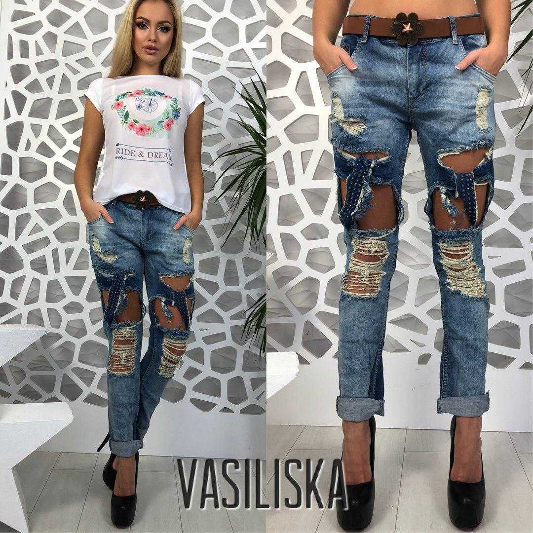 Рваные джинсы, зауженные книзу, подойдут стройным девушкам. Темно-синие и светлые джинсовые штаны украшают горизонтальными вырезами по всей длине штанин. В некоторых моделях дырки делают вертикальными.