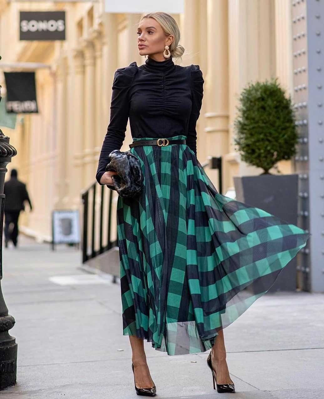 На фото длинная юбка в чёрно-зелёную клетку освежает чёрную блузку в романтичном стиле. Многослойный низ с полупрозрачным верхним слоем, который очаровательно развевается на ветру, становится центром образа