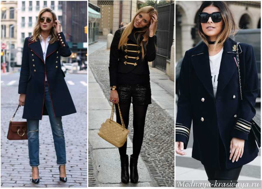 - специфическая отделка. Для военного направления в одежде характерна имитация погон, молнии, заклепки и пуговицы, ремни с массивными пряжками. Также применяются нашивки и эмблемы;