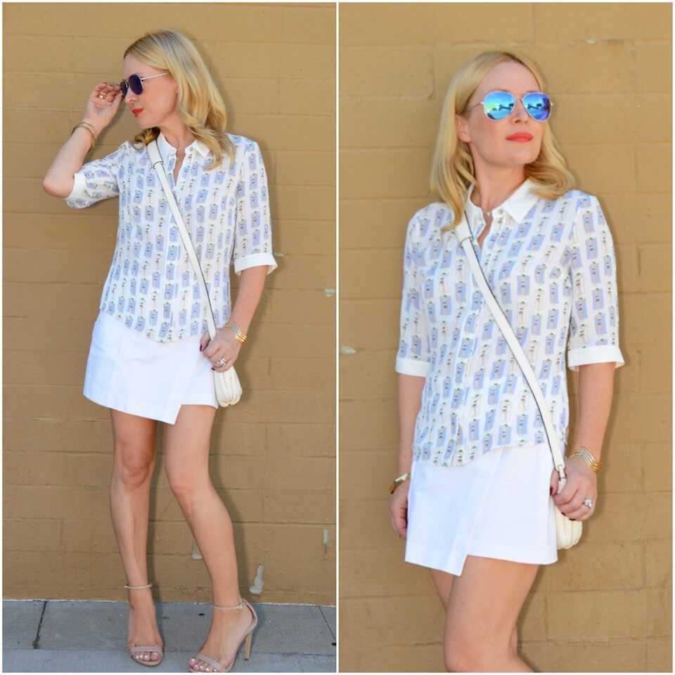 - Короткую асимметричную юбочку стоит носить с короткой же рубашкой, можно совсем без рукавов.