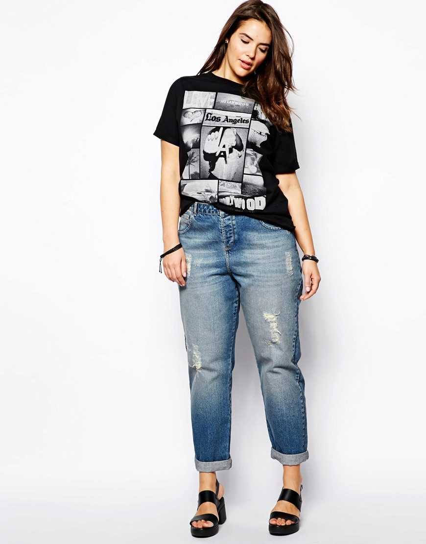 Уникальность изделия в том, что его можно надевать с большим количеством различных вещей, создавая множество луков: для прогулок, деловые, гламурные, праздничные. Модные джинсы для полных необходимо правильно подобрать, чтобы они не выглядели громоздко. Джинсы-бойфренды должны отлично сидеть на бедрах и талии. Декоративных украшений на стильных изделиях для полных должно быть минимальное количество.