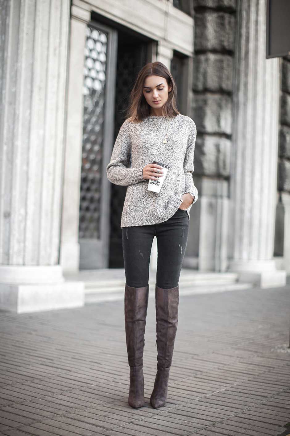 Утепленные джеггинсы отлично вписываются в осенний лук в стиле кэжуал. Интересно будет смотреться наряд в одном цвете, например, в сером. За основу для такого лука следует подобрать простые серые джеггинсы с подвернутыми штанинами. Такой простой низ дополнит верх в стиле оверсайз. Свободный свитер и укороченная кожаная куртка сделают такой лук интересным и гармоничным.