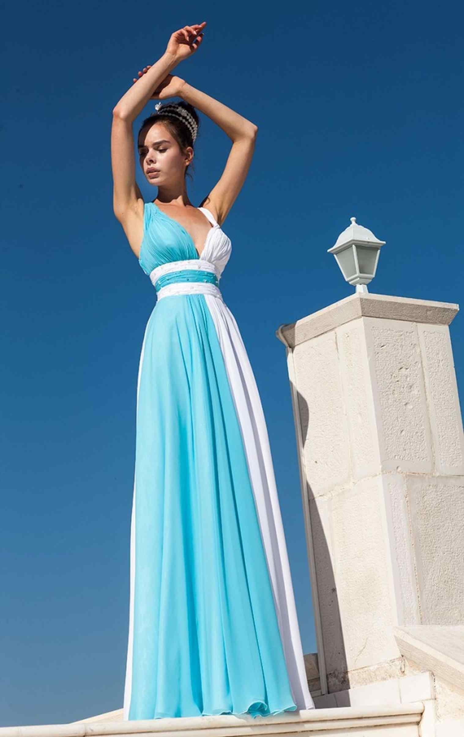 Платье может иметь доминирующий белый цвет, при этом быть дополнено яркими элементами синего и голубого декора или аксессуарами. Например, иметь широкий пояс-ленту, быть украшено голубыми стразами, вышивкой, накладными цветами или оборками. Воздушно и романтично смотрится платье типа «принцесса», с легкими прозрачными воланами, слегка отдекорированными голубым отливом, бусинками или тонкими блестящими нитями.
