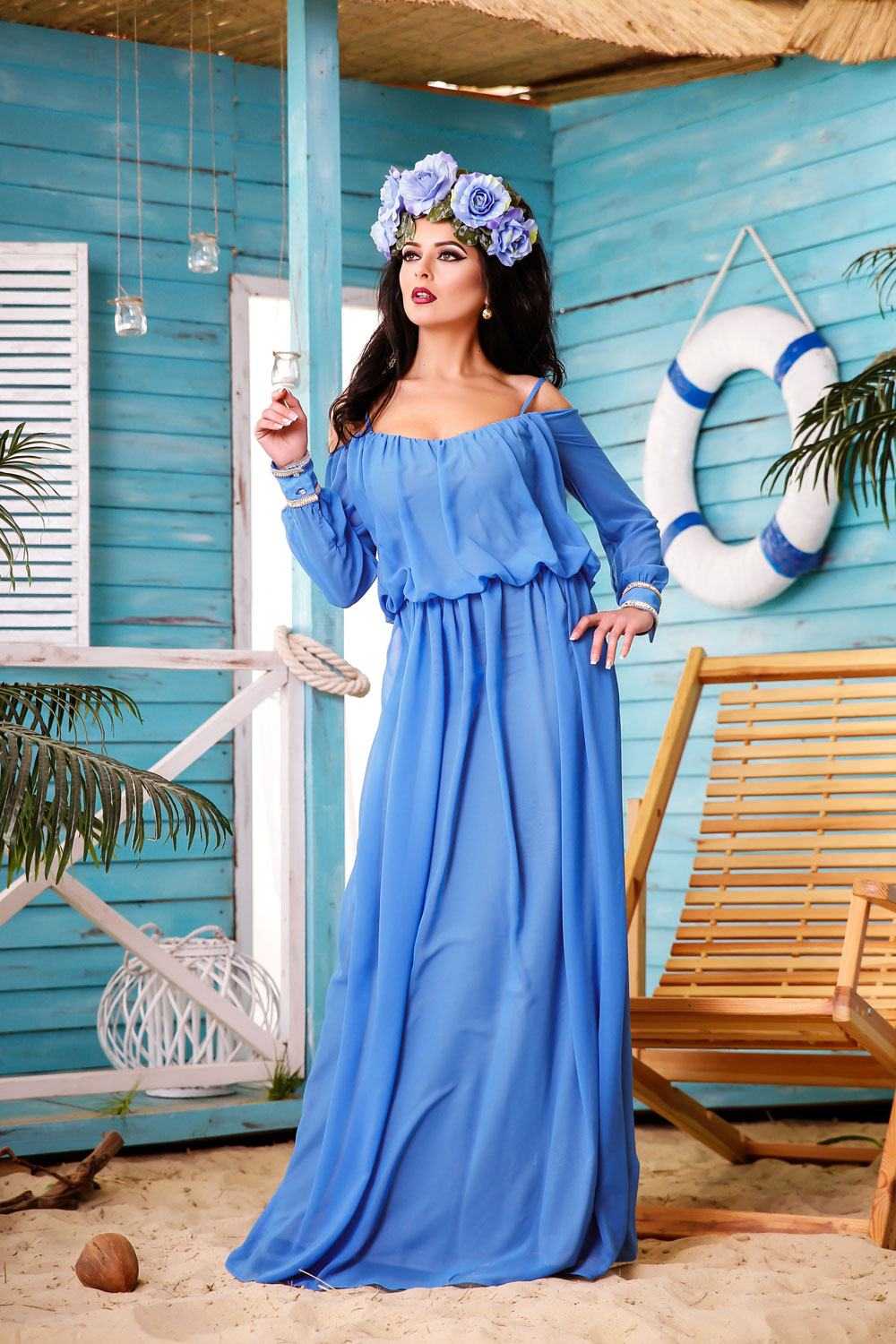 Романтичная модель — голубое вечернее платье с длинными рукавами различного кроя: