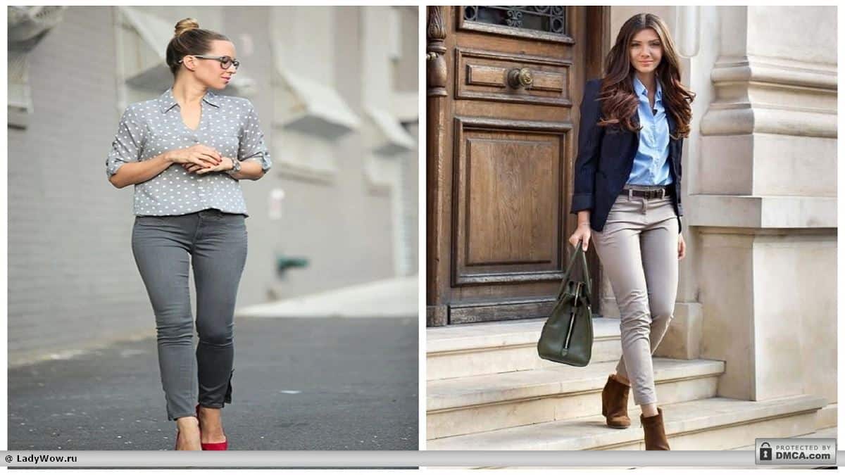 В отличие от вечернего лука, для делового стиля серые джинсы вполне подходят. Разнообразные фасоны блузок сочетаются со скинни, пиджаки и туфли сформируют стильный образ для офиса. Дополнить имидж можно аксессуарами: клатчем, кожаным ремнем, украшениями.