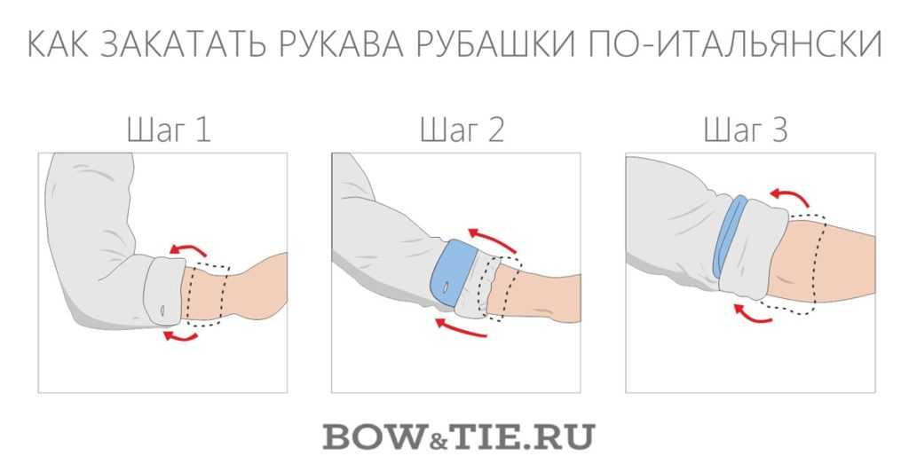 Чтобы манжеты не топорщились и рукава смотрелись аккуратно, можно применить три стильных способа подворачивать рукава рубашки: до плеча, до локтя, и изысканный стиль закатывать рукава по-итальянски.