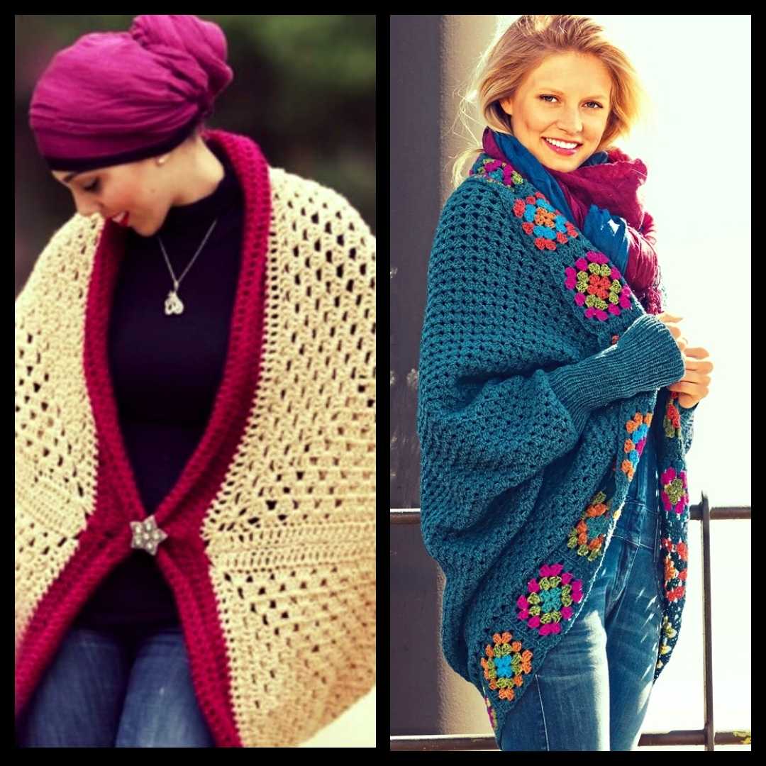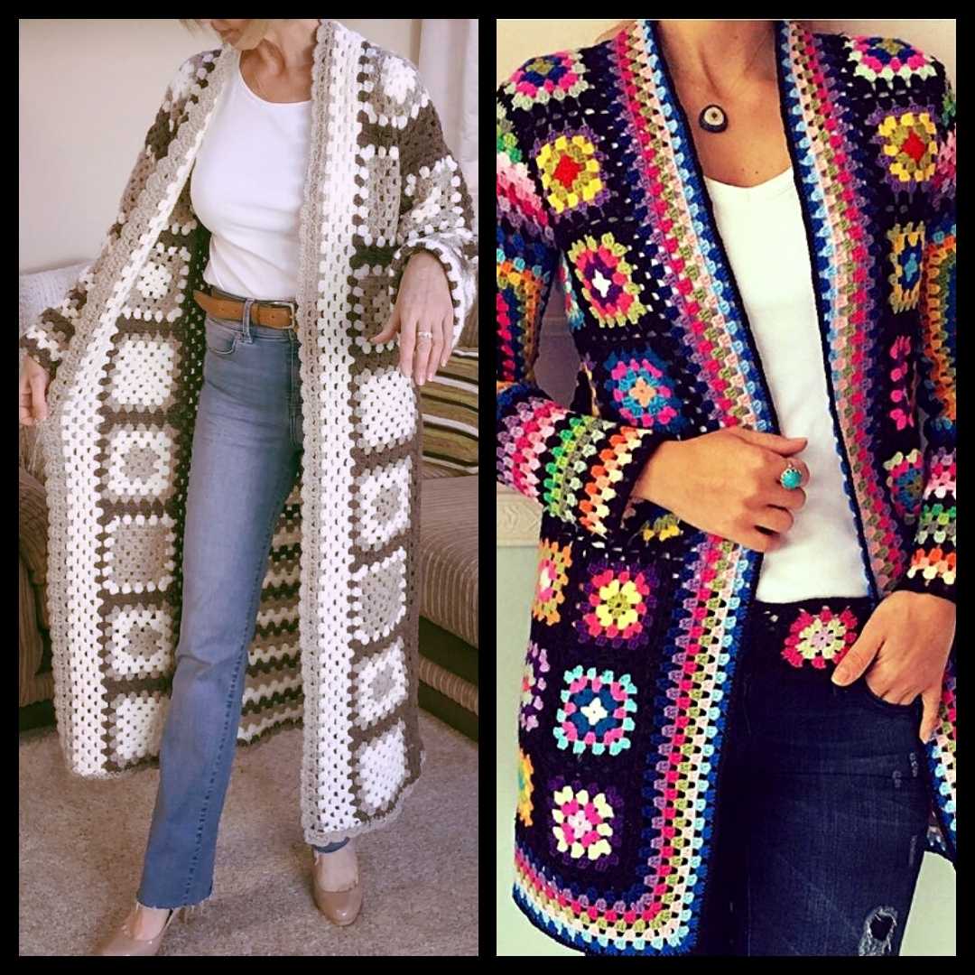 В основе – все тот же «Бабушкин квадрат», связанный столбиками с накидом или, для плотности, столбиками без накида. Этот вариант потребует больше времени и опыта: нужно не только связать, но и сшить фрагменты между собой по выкройке. Зато существенно расширяется выбор фасона. Можно связать кардиган любой длины, даже до щиколоток, с молнией, капюшоном, карманами или широким воротом. Не менее популярны ассиметричные модели, которые также можно связать из фрагментов.