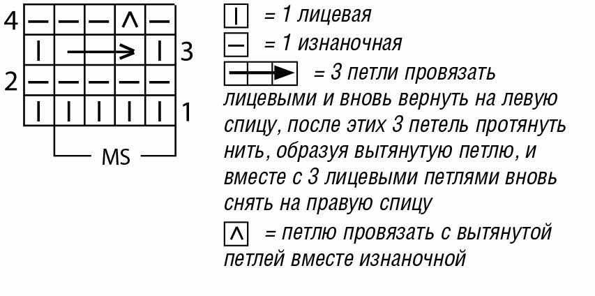 Используемые узоры: резинка 1х1, платочная лицевая вязка (все петли лицевыми), платочная изнаночная (все петли изнаночными), лицевая гладь и рисунок с вытянутыми петлями согласно схеме.