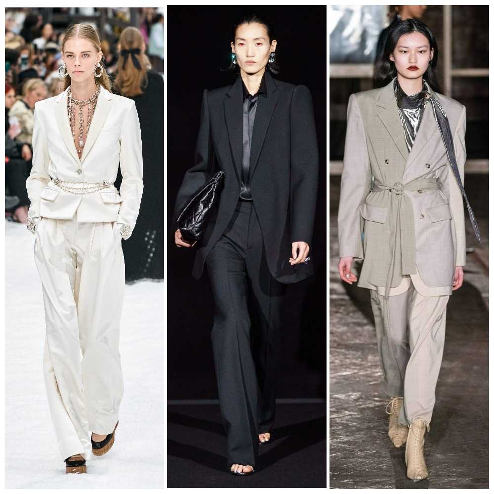 | Balmain | Бренд предлагает своим почитательницам заправлять жакет в брюки и использовать в образах одежду из металлизированных тканей. Много комплектов из денима. В качестве декора используется полоска и широкий пояс. В образах прослеживается заниженная линия рукава, пиджаки с широкими плечами. |