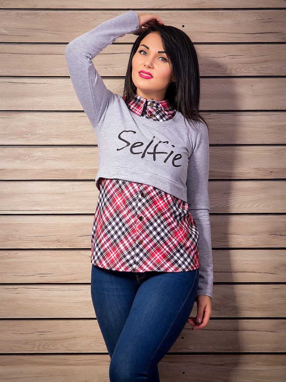 Обманка, состоящая из укороченного свитерка и клетчатой рубашки, станет удобным спортивным вариантом на каждый день. Округлая линия фальш-ворота достаточно глубокая, поэтому аксессуары сюда не подойдут