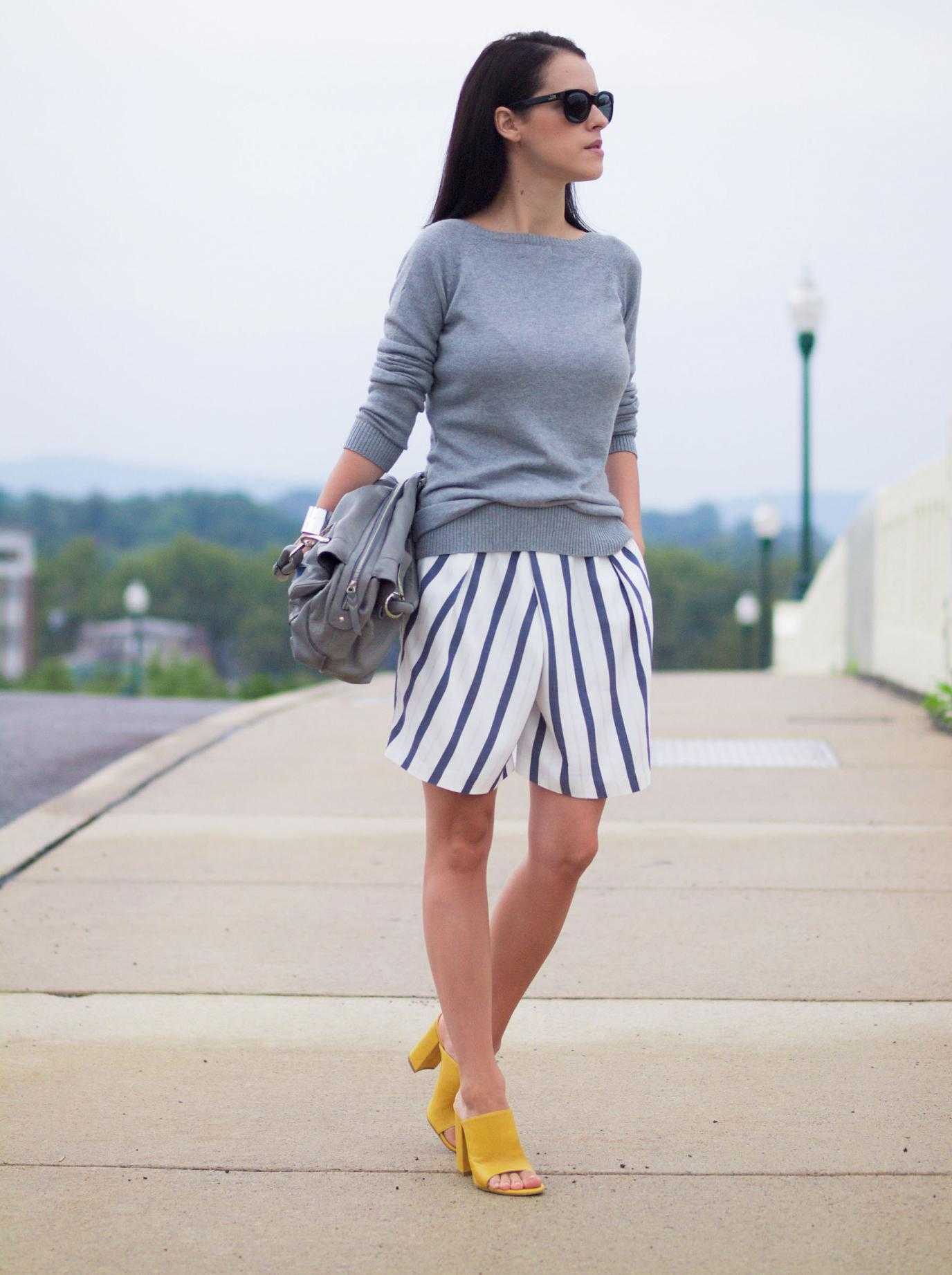 Шорты в клетку или полоску также подойдут длинноногим и высоким девушкам. Если ваш рост ниже среднего или длина ног не позволяет обходиться без каблука, не выбирайте эти модели, можно попробовать только те шорты, у которых вертикальная полоска или клетка с акцентом на вертикаль.