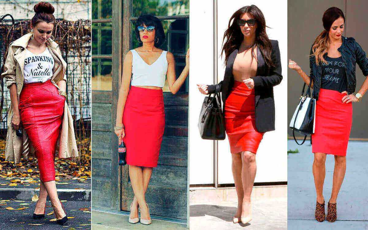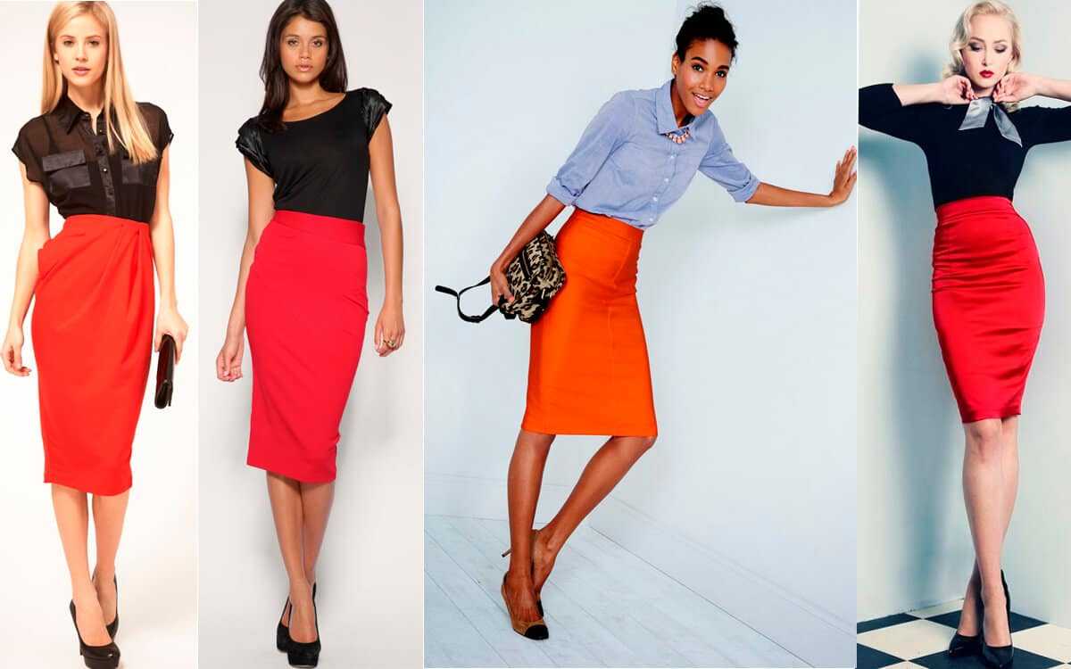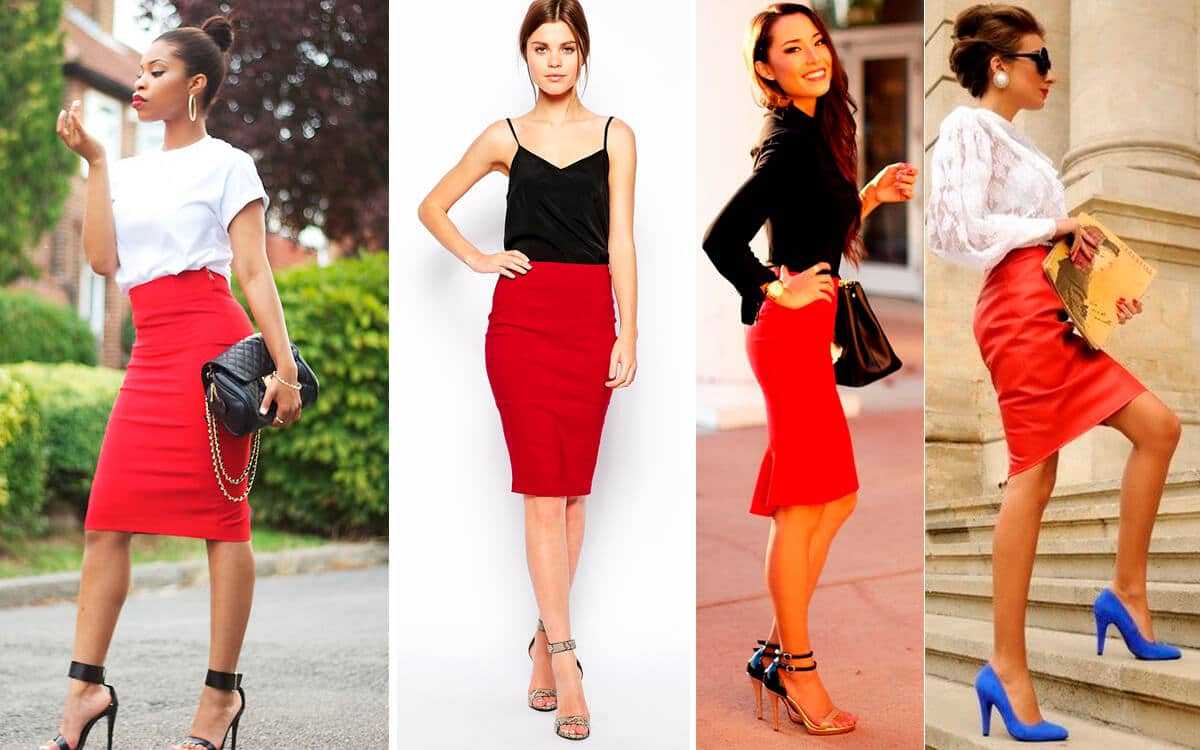 Классический вариант с юбкой- карандаш Вариант первый, классический — красная юбка-карандаш и белая блузка. Прекрасный наряд для походов на работу и не только. Блузка при этом может быть однотонной, с мелким принтом или без него. Дополните образ аксессуарами бежевого или чёрного цвета. Не забудьте туфли на каблуке. Карандаш смотрится одинаково хорошо как на стройных девушках, так и на тех, кто хотел бы скрасить недостатки фигуры.