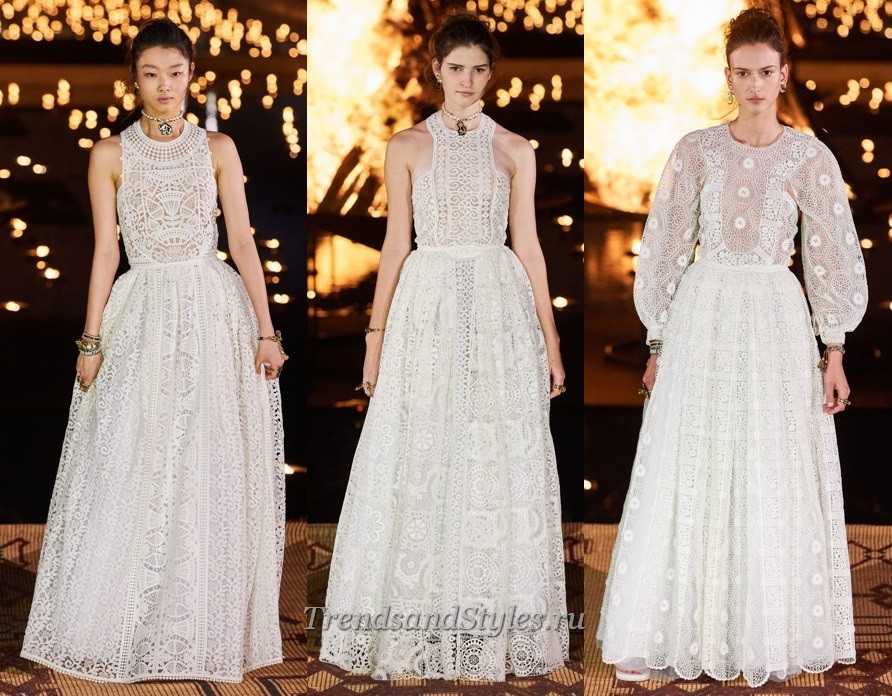 Кружево — символ нежности, романтики. Такие ажурные платья украсили многие коллекции для выпускниц, вечерние платья в пол. Кружевными вставками декорированы летние сарафаны и повседневные уборы.