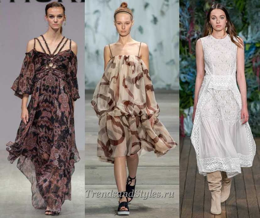 Легкий развивающийся шифон — еще один символ теплого сезона. Такое платье или сарафан привносит долю романтики в любой образ. В этом году шифоновые платья будут украшены узорами, отличаться модным кроем с ниспадающим рукавом, декорироваться ажурными вставками, сборками и драпировками.