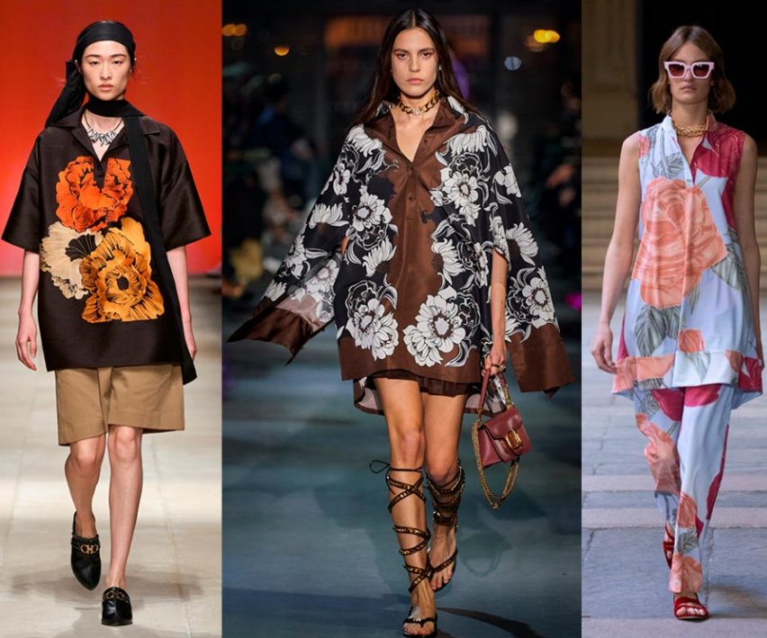 Крупные принты могут полнить и придавать лишние объемы, поэтому пусть большой цветок потеряется на темном поле, или принт располагается вертикальными линиями, или сам крой одежды стройнит.