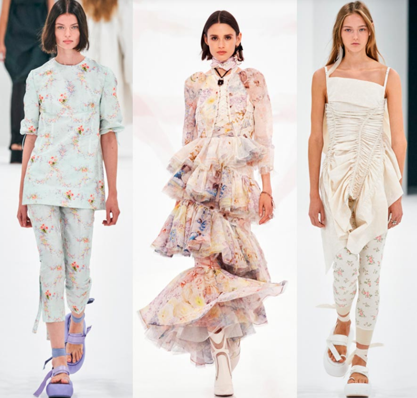 Нежные маленькие цветочки на пастельном фоне смотрятся романтично и благородно. Актуальны платья с принтом “мильфлер” и брюки.