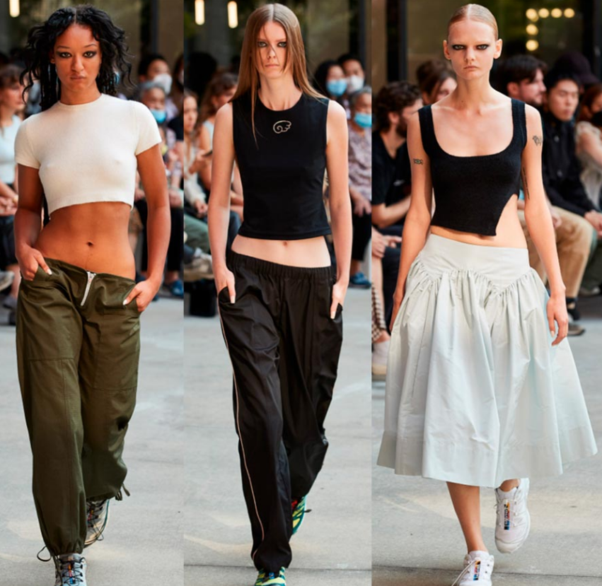 Низкая посадка — абсолютный хит теплого сезона 2022. Не хотите демонстрировать живот — носите рубашку навыпуск, удлиненный жакет. Заправлять верх в низ не получится, поэтому либо носим кроп-топ, либо перекрываем юбку и брюки с низкой посадкой длинным верхом. Брюки с низкой посадкой удлиняют торс и делают ноги короче, поэтому присмотритесь к обуви на высоком каблуке и платформе.