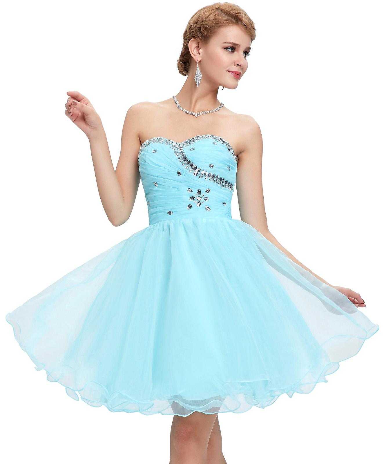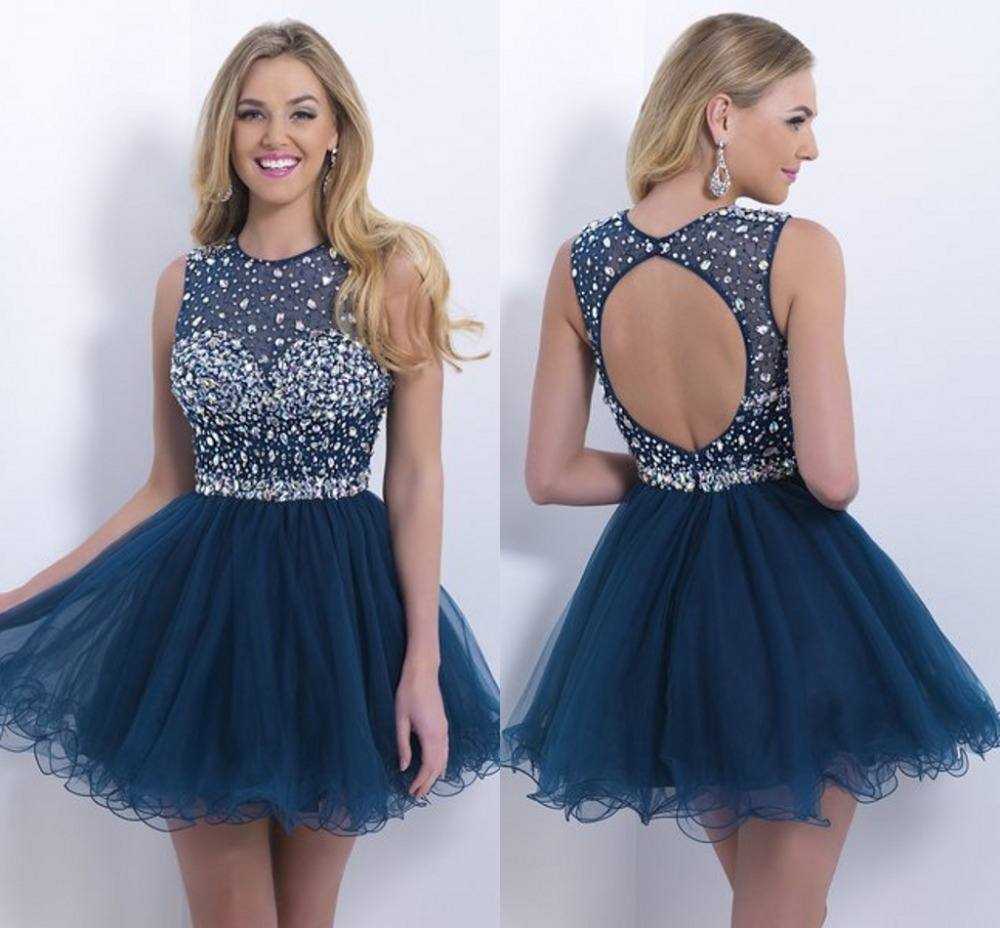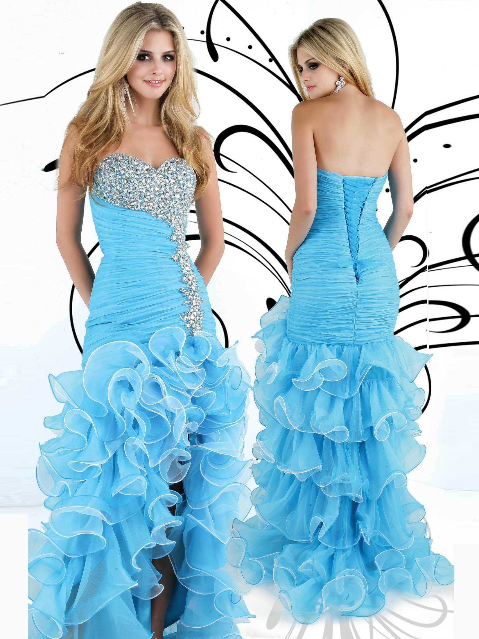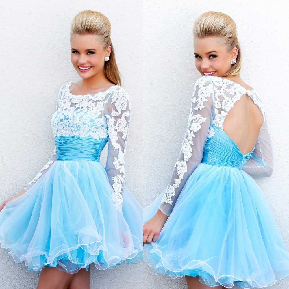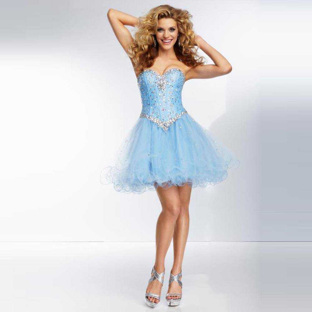 Например, синие короткое платье с пышной юбкой, верх, которого украшен сине-голубыми пайетками отлично подходит для выпускного бала, образ с ним будет смотреться ярким, стильным и привлекательным.