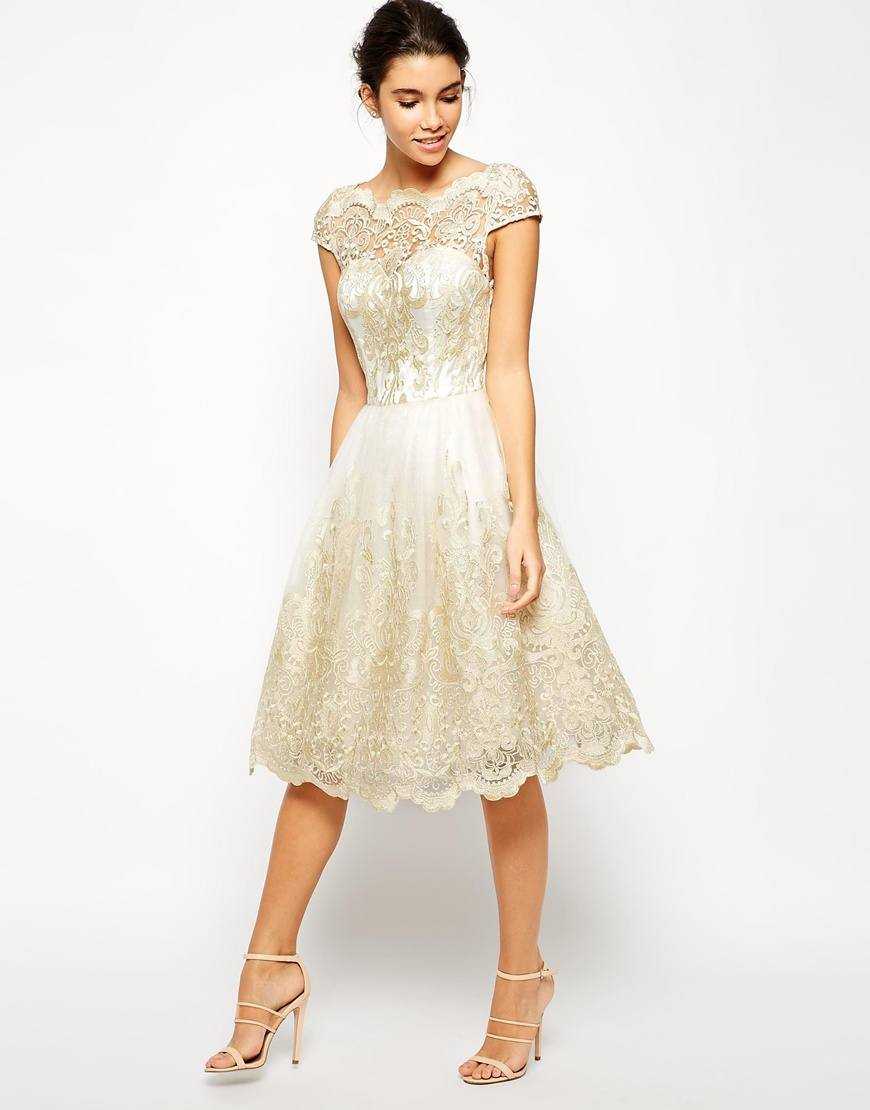 - Выше колена с акцентом на талии. Наиболее яркой в этом платье является верхняя часть, ведь она может украшаться узорами, кружевами или камнями. В зоне декольте здесь нет необходимости делать глубокий вырез. Нижняя часть платья при этом ничем не усложняется. Такой вариант может дополняться еще и длинными прозрачными рукавами, или обильной вышивкой.