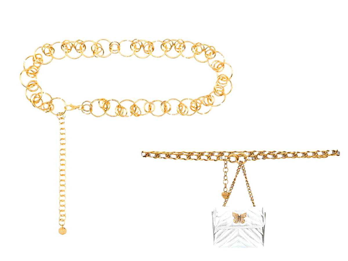 Прекрасное возвращение в 00-е гг.: в моде снова ремни-цепочки и декор из страз. Самый практичный вариант маленькая поясная сумочка на таком ремне.