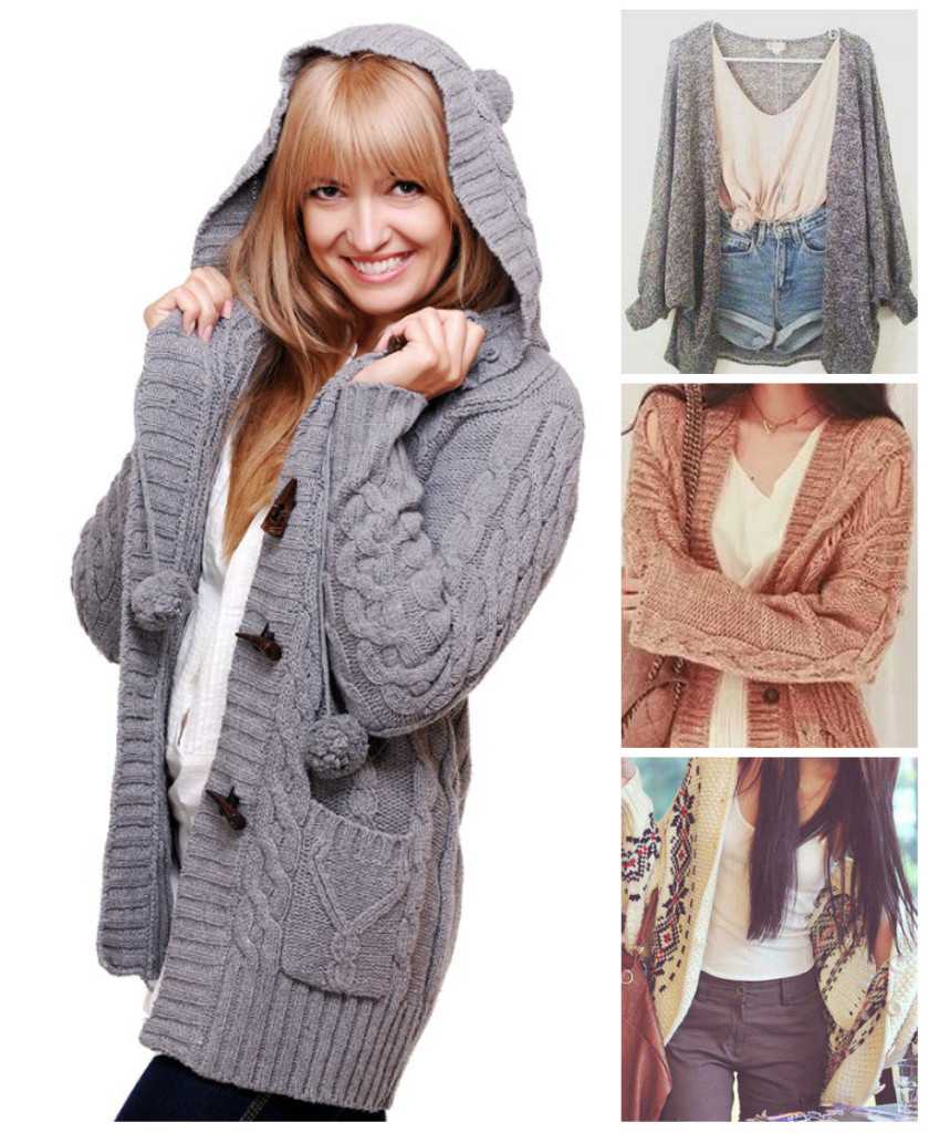 - длинные и свободные вязаные жакеты – с короткими юбками и платьями, их длина должна на 5-7 см отличаться от длины кардигана, смелые девушки могут носить такой вид одежды с шортами;