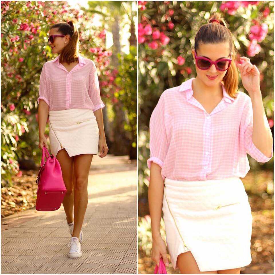 Белая мини-юбка, розовая рубашка и белые кеды – великолепный образ для прогулок и увлекательных путешествий.
