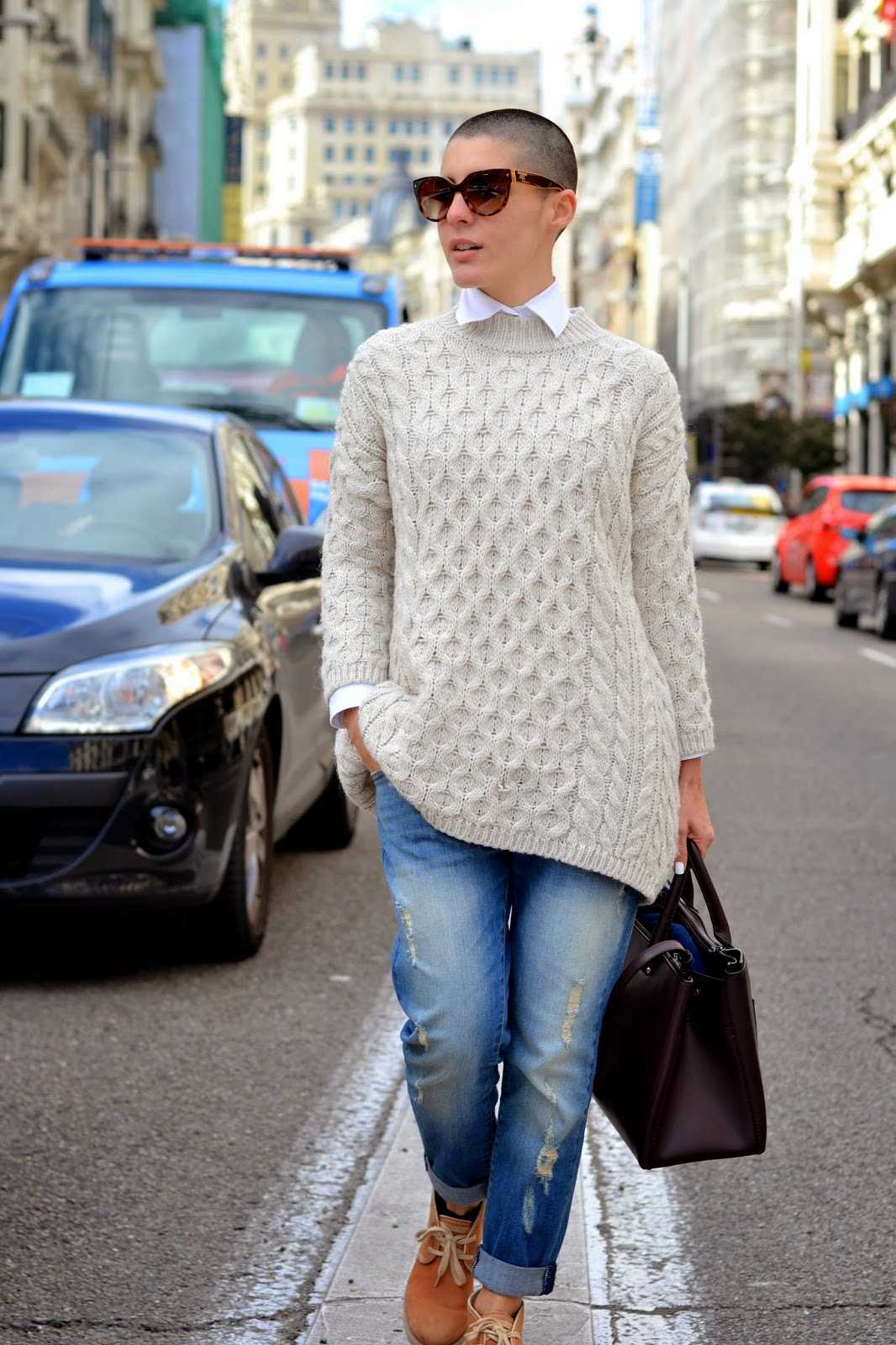 Свободный удлиненный свитер с рельефной вязкой просто очаровательно выглядит с джинсами. Малозаметная деталь в виде воротничка и манжет ясно дает понять, что модель точно знает, как носить рубашку с джемпером женщине. Без нее это был бы просто растянутый свитер с джинсами.