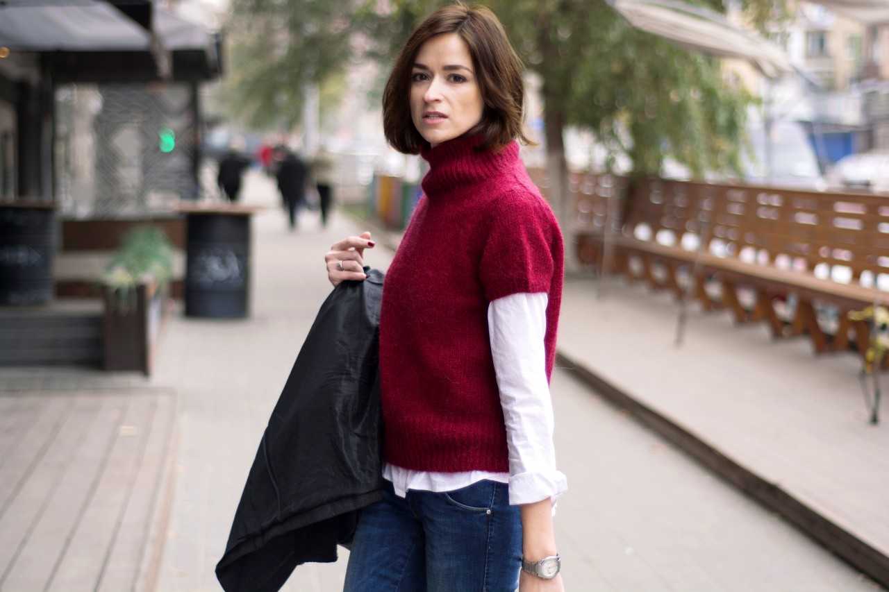 В этом варианте соединились два элемента монохромных сетов – высокий ворот и короткий рукав теплого шерстяного свитера. Насыщенный вишневый оттенок позволяет не использовать других ярких элементов. Особого внимания заслуживают волосы модели, заправленные под воротник. Такой нехитрый прием сразу добавил в этот street look уютного тепла, которое оценят любительницы комфорта, раздумывающие как носить рубашку под свитером.