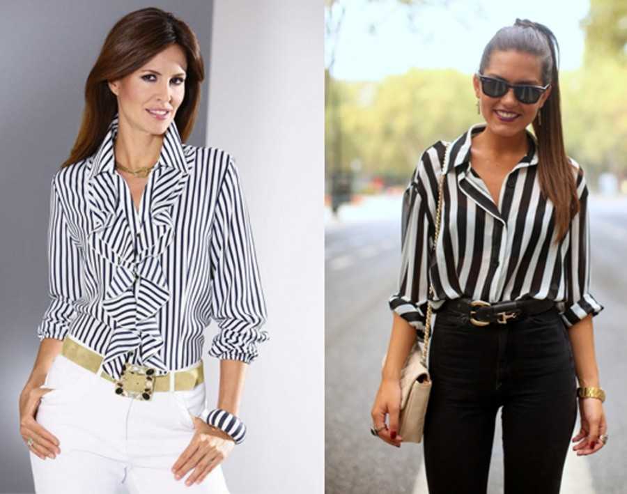 Рубашка в вертикальную полоску подходит любым типам женских фигур. Она поможет удлинить, вытянуть фигуру. Особенно, если полоска мелкая черно-белая или бело-синяя. Полные женщины удачно пользуются таким правилом для стройнящего эффекта. Горизонтальные полосы, в том числе крупные, широкие, способны визуально добавить несколько нежелательных килограммов и расширить фигуру. Этим свойством можно удачно пользоваться для увеличения отдельных частей тела, например, груди или плечей.