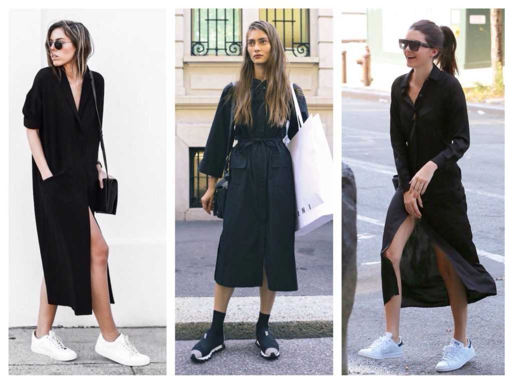 У городских модниц в почете сочетание кроссовок с платьем-макси. Самая любимая и трендовая модель – это прямое платье с боковыми разрезами.