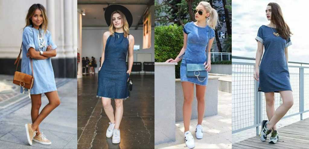 Джинсовые идеи. Тандем кроссовки с платьем из джинса – универсальное решение, в котором яркие акценты можно расставить с помощью различных аксессуаров (броские браслеты, крупные серьги, небольшие рюкзаки), сделав образ еще более интересным и нескучным;